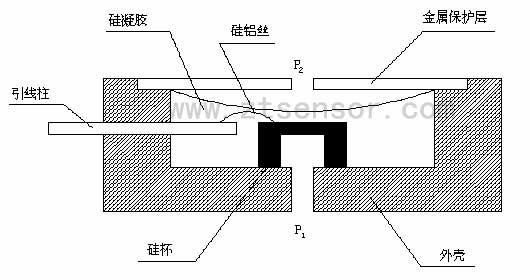 通過硅平面集成工藝技術(shù)在硅片上制作四個(gè)擴(kuò)散電阻作為應(yīng)力敏感元件,用機(jī)械研磨加各向同性化學(xué)腐蝕方法將硅襯底加工成周邊固支的平膜片彈性力學(xué)結(jié)構(gòu)。四個(gè)力敏電阻,連成惠斯頓全橋應(yīng)變電路,這種電路具有最高的靈敏度、最好的溫度補(bǔ)償性能和最高的輸出線性度。硅杯受到一個(gè)差值壓力,力敏電阻的電阻率改變,引起電阻阻值改變。電阻率的改變是由于硅膜片的形變引起的,測試端P1與引壓端P2的壓力差與硅膜片的形變成正比,也就是電橋的輸出與壓力差成正比。