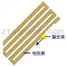 通過薄膜補(bǔ)償電阻網(wǎng)絡(luò)的組合,可以將傳感器的零點(diǎn)控制在±2000μV范圍內(nèi),但傳感器的零點(diǎn)輸出要求滿足±500μV要求。而且傳感器經(jīng)過高低溫、加載疲勞、長期的零點(diǎn)時(shí)漂后,還要保證輸出在±500μV內(nèi),這需要在傳感器的裝配、調(diào)試過程中反復(fù)補(bǔ)償。僅通過電阻組合或外并電阻補(bǔ)償,工藝調(diào)試量大,也很難準(zhǔn)確到位。在本項(xiàng)目中,加入了先進(jìn)的激光調(diào)阻工藝,對電阻條的阻值進(jìn)行修正。激光調(diào)阻示意圖如圖2。