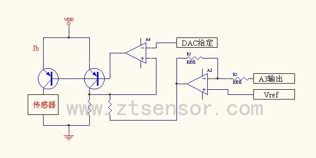 圖中A2的輸出隨A3輸出增大而減小,使A4控制的電流源基準(zhǔn)電流增大,從而使傳感器的激勵(lì)電流增大,形成一個(gè)部分由輸出控制的壓控電流源。改變反饋參數(shù),可校正不同的非線性誤差。